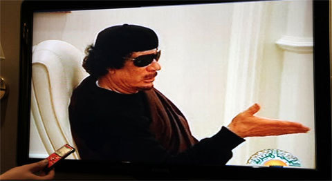 Khi quân nổi dậy tiếp tục giành lợi thế và Nato tăng cường công kích, sự xuất hiện của Gaddafi thu hẹp dần. Thỉnh thoảng truyền hình quốc gia phát đi hình ảnh ông hoặc bài phát biểu thúc giục những người ủng hộ chiến đấu. |