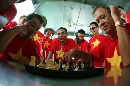 Cả tầu có mỗi cái bàn cờ vua. Hôm đầu mật độ quây quanh cái bàn cờ này luôn đông đặc. Hai "kỳ thủ" ngồi hai bên, mặt đỏ tía tai, chả biết là căng thẳng hay là do thiếu không khí. Xung quanh là các "quân sư" đông nghịt, có người thì ủng hộ 1 bên, có người ủng hộ cả hai bên.