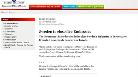 Ngày 22/12, Chính phủ Thụy Điển ra thông báo trong năm 2011 sẽ đóng cửa Đại sứ quán tại Buenos Aires (Argentina), Brussels (Bỉ), Hà Nội (Việt Nam), Kuala Lumpur (Malaysia) và Luanda (Angola).