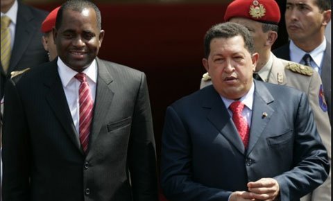 Tổng thống Venezuela Hugo Chavez bên cạnh Thủ tướng Dominica Roosevelt Skerrit trong buổi đón tiếp ở Caracas. Skerrit, 40 tuổi, trở thành thủ tướng từ năm 2004. Ông học tại Đại học New Mexico của Mỹ và ra trường với tấm bằng đại học chuyên ngành tiếng Anh cùng bằng tâm lý tại Đại học Mississippi. Năm 2000, ông được bầu vào Quốc hội và giữ vai trò Bộ trưởng Giáo dục. Khi cựu thủ tướng Pierre Charles đột ngột qua đời vì đau tim, ông được tiến cử thay thế và nhậm chức năm 2004 khi mới 32 tuổi