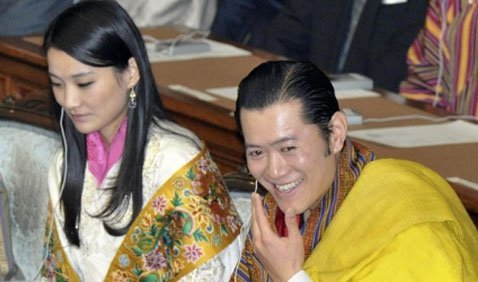 Quốc vương của Bhutan, Jigme Khesar Namgyel Wangchuck, 36 tuổi, mỉm cười với hoàng hậu Jetsun Pema sau một bài phát biểu tại Nghị viện Nhật Bản ở Tokyo. Ông lên ngôi năm 28 tuổi