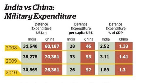 | Chi tiêu quân sự Ấn Độ - Trung Quốc. Cột 1: Mức chi tiêu quân sự nói chung (tính theo triệu USD). Cột 2: Chi tiêu quân sự tính theo đầu người (USD). Cột 3: Chi tiêu quân sự trong GDP |