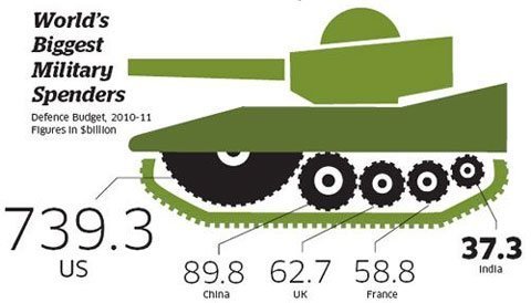 | Những nhà chi tiêu quân sự lớn nhất thế giới. Ngân sách quốc phòng 2010-2011. Con số tính theo tỉ USD. Lần lượt từ trái qua phải: Mỹ, Trung Quốc, Anh, Pháp, Ấn Độ |