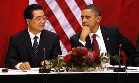 Chủ tịch Trung Quốc Hồ Cẩm Đào và Tổng thống Mỹ Obama trong cuộc gặp với các lãnh đạo doanh nghiệp. Ảnh: Reuters
