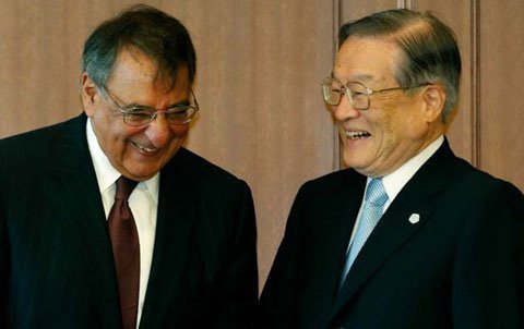 | Bộ trưởng Quốc phòng Mỹ Leon Panetta và người đồng nhiệm Nhật Bản Satoshi Morimoto. Ảnh: AP |