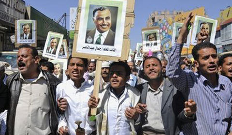 | Người biểu tình tại Sanaa, Yemen ủng hộ người biểu tình Ai Cập. Ảnh: AP |