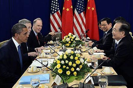 | Tổng thống Mỹ Barack Obama trong cuộc gặp với Thủ tướng Trung Quốc Ôn Gia Bảo. Ảnh: THX |
