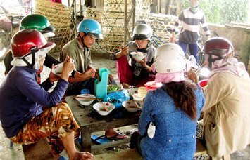 | Bữa trưa vội vàng giữa chợ heo Bà Rén của các chị |