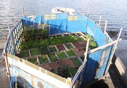 Những vườn rau xanh nhỏ bé và hiếm hoi ấy được che chắn bằng những thanh gỗ ván, những mảnh bao bì, bao ni-lông, mảnh vỡ của mạn thuyền hay thùng phuy, téc nước...