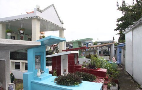 Xen giữa những hàng bia mộ câm lặng là đài tưởng niệm khắc bức phù điêu một nữ nghệ sỹ đang ôm đàn gảy khúc đàn trời. Không hiếm hoi những phần mộ được thân nhân dựng thành căn gác hai tầng, có ban công rộng rãi.