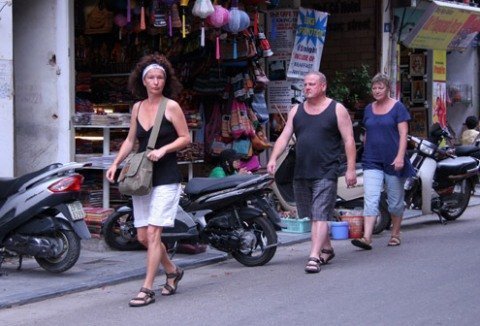 Du khách Hà Nội không có lối đi bộ trên vỉa hè HN. Ảnh: VNE |