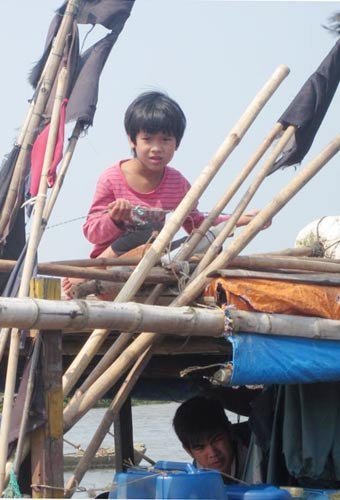 Tôi xuống thuyền của gia đình anh Phạm Văn Ngọc và chị Nguyễn Thị Tốt. Chiếc thuyền nhỏ chỉ rộng chưa đầy 10 mét vuông nhưng là nơi ăn, ngủ, sinh hoạt cho 6 thành viên trong gia đình.