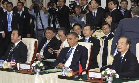 Tổng thống Mỹ Barack Obama (giữa), Thủ tướng Nhật Bản Yoshihiko Noda (trái) và Thủ tướng Trung Quốc Ôn Gia Bảo tại EAS. Ảnh: AP |