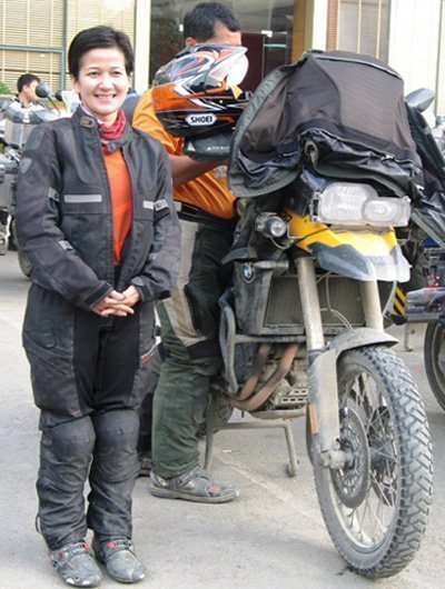 Nhân vật nữ thứ hai trong đoàn đi cùng chiếc mô tô màu trắng điệu đà của BMW.