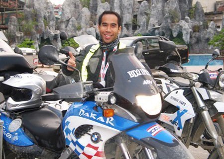 Nhiều thiết bị định vị và camera được lắp trên xe mô tô. Anh bạn người Thái này đang chỉnh sửa lại thiết bị định vị trước khi khởi hành.