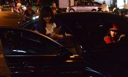 Em gái của Angela Phương Trinh bước ra khỏi xe.
