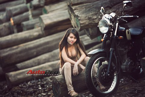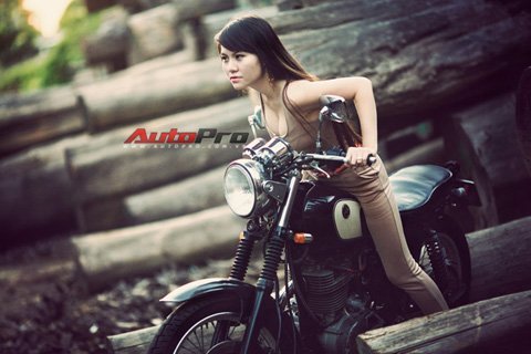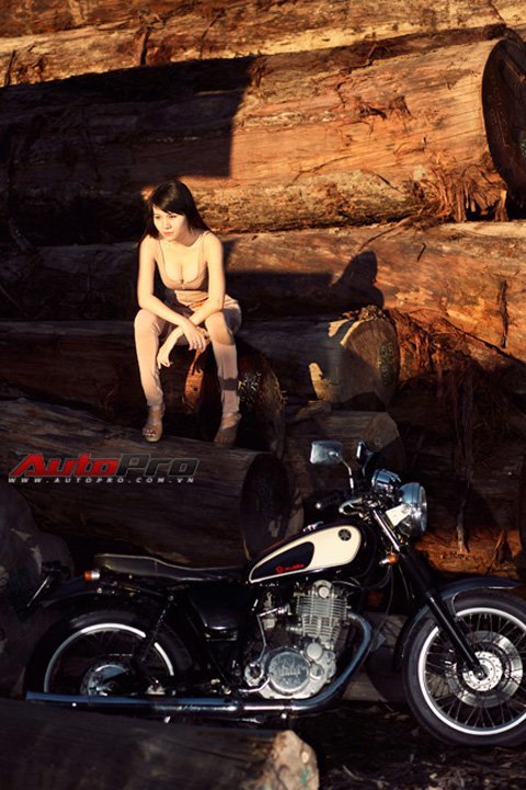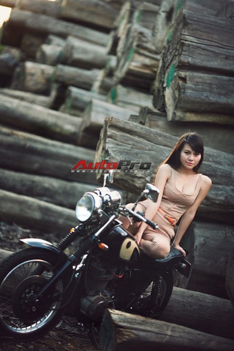 Bộ trang phục bó sát đã tôn toàn bộ đường cong nóng bỏng của ca sỹ Minh Uyên bên chiếc xe Yamaha SR500.