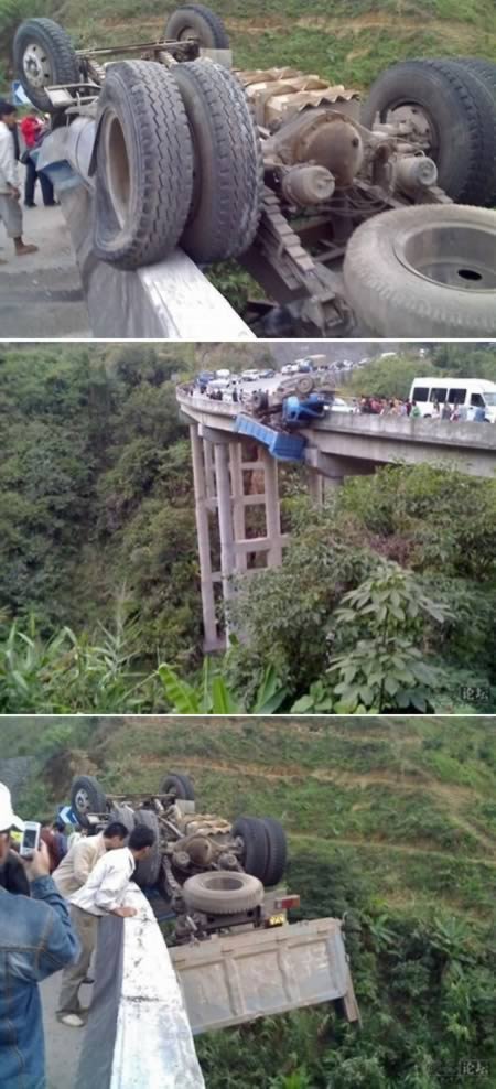 Rơi xuống từ độ cao 61 m đã đủ khiến chúng ta phải từ biệt cõi đời này chứ đừng nói đến rơi cùng chiếc xe tải. Nhưng thật may, hai bánh xe vẫn còn vướng lại trên cầu đã giúp lái xe người Trung Quốc có thể thở phào nhẹ nhõm.