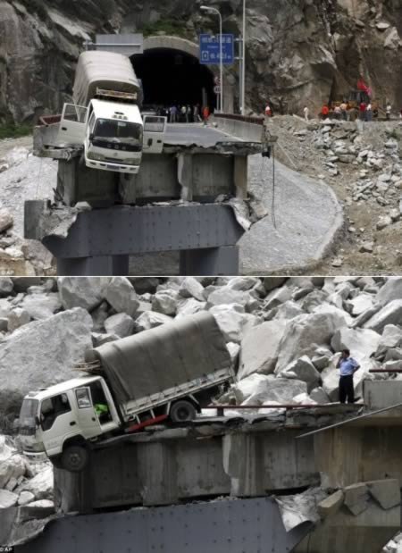 Không biết ai đã cầu nguyện cho chàng lái xe tải này, nhưng dù đó là bất kỳ ai cũng sẽ khiếp đảm khi chứng kiến cảnh tượng “ngàn cân treo sợi tóc” này ở tỉnh Tứ Xuyên, Trung Quốc.