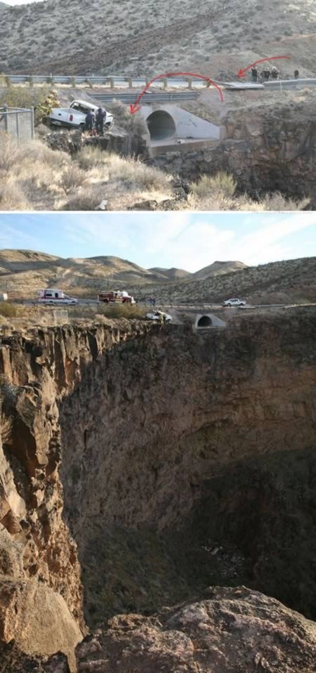 Hố tử thần - Ác mộng trên đường đối với những người lái xe. Nhưng may mắn vẫn mỉm cười với người lái xe này khi bị mắc kẹt trên miệng hố rộng 4 m xuất hiện trên đường ở tỉnh Giang Tây, Trung Quốc.