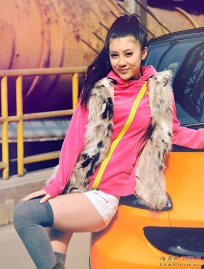 Người đẹp trẻ trung và gợi cảm trong trang phục soóc trắng và áo màu hồng bên cạnh siêu xe màu cam nổi bật.
