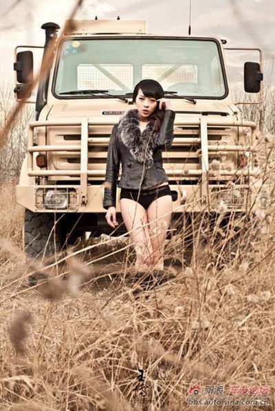 Cô người mẫu phô diễn nét mạnh mẽ cá tính nhưng không kém phần quyến rũ bên chiếc xe tải chuyên dụng.