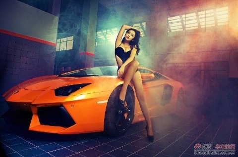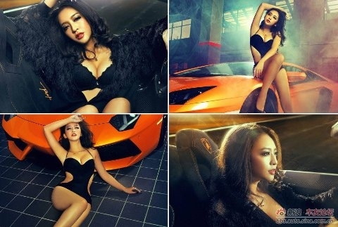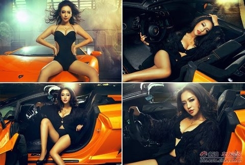Cô người mẫu diện bộ đồ cực kì nóng bỏng tạo dáng bên siêu bò Lamborghini.