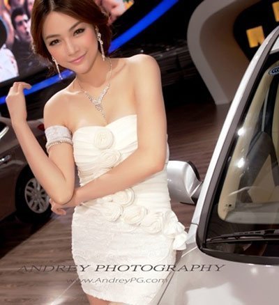 Người mẫu xinh đẹp với khuôn mặt hút hồn tạo dáng bên những chiếc xe hơi bóng loáng tại triển lãm xế hộp.