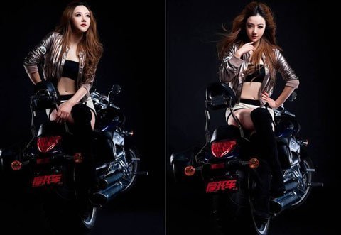 Người đẹp diện trang phục nội y màu đen khoe dáng nóng bỏng và cuốn hút bên chiếc Harley Davidson đen bóng mạnh mẽ.