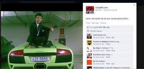 Những bức ảnh về một thanh niên ngồi lên trên chiếc Lamborghini màu xanh biển "tứ tám" tại Việt Nam đã nhanh chóng lên các trang báo quốc tế.