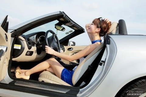 Cô người mẫu với khuôn mặt thanh tú và dáng người mảnh khảnh khoe chân dài bên chiếc mui trần Mercedes SLK.