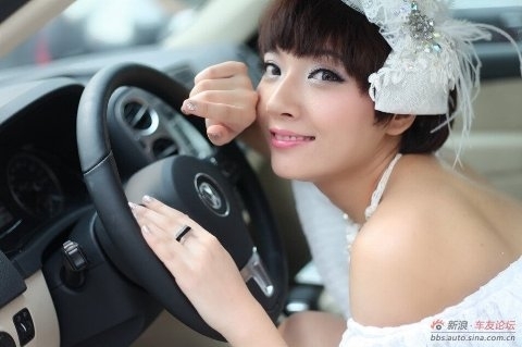 Cô người mẫu với mái tóc ngắn cá tính và nghịch ngợm tạo dáng tự tin bên chiếc xe hơi đời mới.