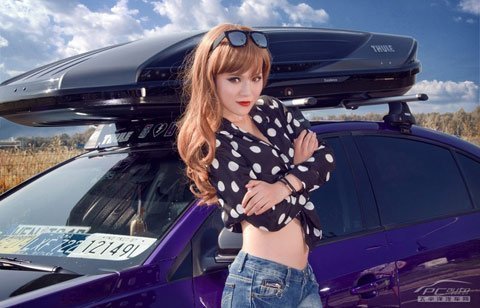 Người đẹp trẻ trung và gợi cảm trong trang phục áo chấm bi buộc cao và chiếc quần soóc denim khoe chân dài trắng mịn bên siêu xe màu tím.