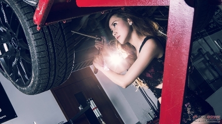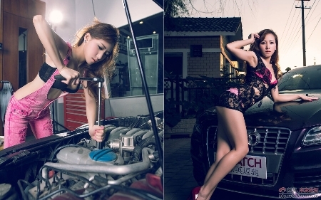 Cô nàng người mẫu gợi cảm tạo dáng sửa xe bên xế sang.
