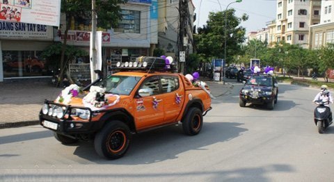 Thế nhưng rước dâu bằng những chiếc xe bán tải Triton (Mitsubishi) nối dài trông rất độc đáo khiến nhiều người đi đường phải ngoái lại.