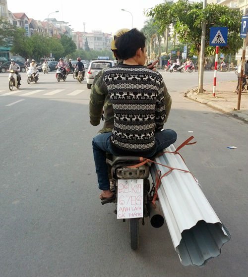 Chiếc xe này được chằng buộc thêm bên cạnh một tấm tôn quá khổ được cuộn tròn. Tấm tôn cồng kềnh khiến người điều khiển xe máy phải co chân phải trong khi di chuyển và cũng không thể nhấn được phanh giảm tốc độ của chiếc xe.