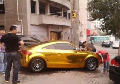 Mẫu xe thể thao 2 cửa tiền tỉ này được “chộp” tại một cửa hàng rửa xe tại thành phố Trịnh Châu, Trung Quốc. Toàn bộ thân xe được mạ vàng long lanh, hoàn toàn khác biệt so với những tông màu gốc của hãng xe Đức. Audi TT được sản xuất từ năm 1998 cho đến nay với hai phiên bản Coupe và mui trần Roadster. Kiểu dáng của Audi TT có nét giống với mẫu xe “con bọ” Beetle của Volkswagen, tập đoàn chủ quản của Audi. Năm 2009, Audi đã cho ra mắt những phiên bản TT RS. Đây là dòng xe hiệu suất cao của hãng xe Đức.