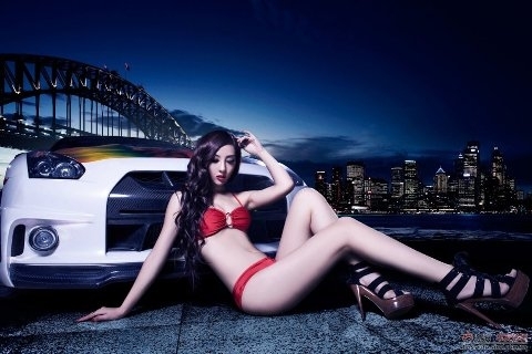 Chiếc xế hộp thể thao độ làm nền cho cô người mẫu trong trang phục bikini đỏ nóng bỏng với những đường cong hoàn mỹ tỏa sáng.