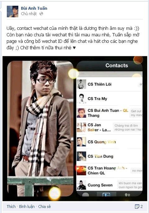 Facebook của cả hai người thu hút sự quan tâm của hàng chục nghìn người theo dõi, cập nhật thông tin mọi lúc, mọi nơi. Tuy nhiên trong thời gian gần đây, cộng đồng mạng lại tỏ ra bức xúc với Bùi Anh Tuấn và Bảo Anh về những thông tin mà hai ca sỹ này đăng tải trên trang cá nhân liên quan đến ứng dụng WeChat của Trung Quốc.