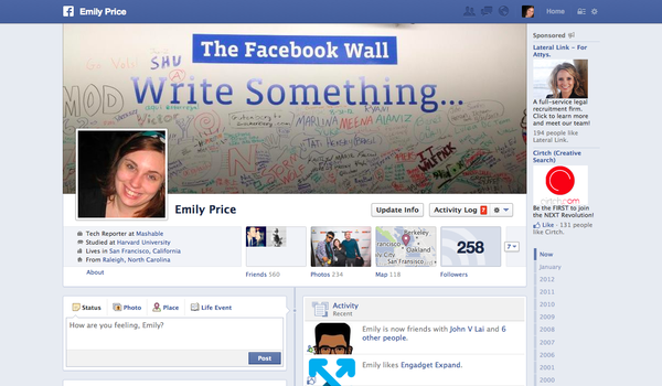 Thanh Timeline thay vì nằm ở giữa màn hình giờ sẽ được chuyển sang phía góc màn hình bên phải, thế chỗ cho vị trí của bản đồ cũng như quảng cáo trong thiết kế hiện tại. Danh sách các ứng dụng được ưa thích, các trang ưa thích sẽ tiếp tục được đưa về bên trái trong khi cập nhật trạng thái nằm ở bên phải. Thiết kế mới sẽ khiến sự tập trung của người dùng được nâng cao hơn về cả các cập nhật trạng thái cũng như những tính năng phụ trên Facebook.