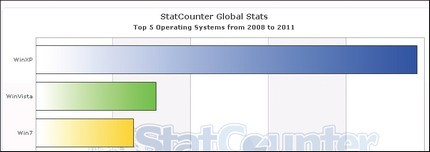 Cho tới thời điểm này, theo Statcounter, Windows XP vẫn chiếm tới 48,34% người dùng toàn cầu (so với năm 2009 là 69,57% - giảm 21,23%) còn Windows 7 đứng thứ hai với chỉ 28,61% (so với năm 2009 là 1,84%, tăng 26,77%). Đứng thứ ba là Windows Vista chiếm tỉ lệ 14,6% (so với năm 2009 là 22,09% - tức giảm 7,49%). Dễ dàng nhận thấy, tổng lượng sụt giảm của Windows XP và Windows Vista chính là lượng tăng của Windows 7. Như vậy, để Windows 7 có thể vươn lên vị trí thống trị như Windows XP vào năm 2008 là 75,98% thì theo các chuyên gia, phải cần ít nhất hơn... 2 năm nữa.