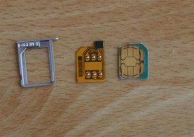 Bộ bẻ khóa gồm có khay sim, bảng vi mạch. Bên phải là micro sim được nhỏ cắt ra để dùng cho iPhone 4.