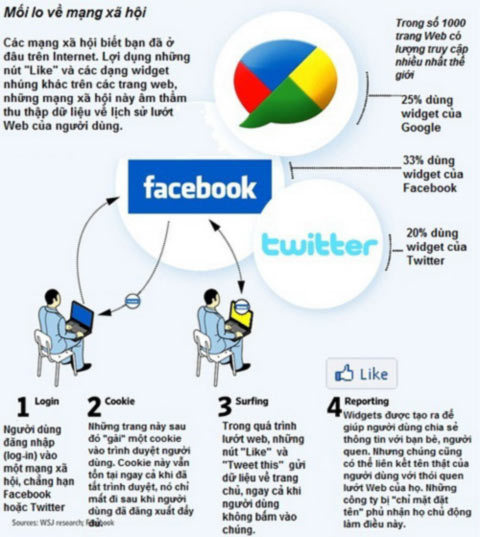 Người dùng thường nhấn nút “Like” trên Facebook hoặc “Tweet” trên Twitter như hình thức chia sẻ thông tin/ý kiến với bạn bè. Nhưng mới đây người ta phát hiện Facebook cũng như Twitter đã lợi dụng nút bấm này để thu thập dữ liệu về những thông tin người dùng tìm kiếm, hoặc trang web họ ghé thăm.
