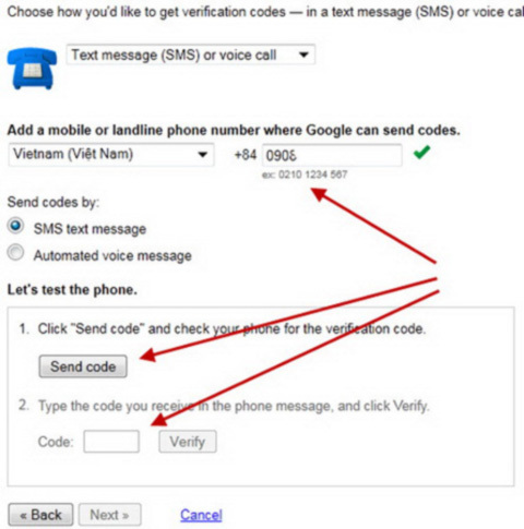 * Điện thoại di động (ĐTDĐ): Gmail đã hỗ trợ đầy đủ cho người dùng Việt Nam nên có thể chọn "Text message (SMS) or voice call" và chọn tiếp "Vietnam (Việt Nam)" ở phần "Add a mobile or landline phone number where Google can send codes". Sau đó nhập đầy đủ số điện thoại di động vào ô trống kế bên. Hệ thống sẽ kiểm tra số điện thoại vừa cung cấp có hợp lệ hay không, khi biểu tượng màu xanh lá cây xuất hiện là bạn đã có thể chuyển xuống phần bên dưới.