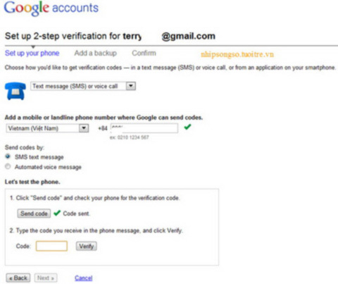 Bạn nên chọn phần "SMS Text message" để Google gửi tin nhắn đến số ĐTDĐ đăng ký ở trên. Nhấn tiếp vào nút "Send code" và chờ vài giây để hệ thống tổng đài của Google gửi vào ĐTDĐ của bạn mã số đăng ký và lưu ý không tắt cửa sổ trình duyệt hiện hành. Dùng mã số này để nhập vào ô Code ở phần "Type the code you receive in the phone message, and click Verify". Nhấn Verify để xác nhận sử dụng số ĐTDĐ trên để nhận mã chứng thực đăng nhập từ Google.