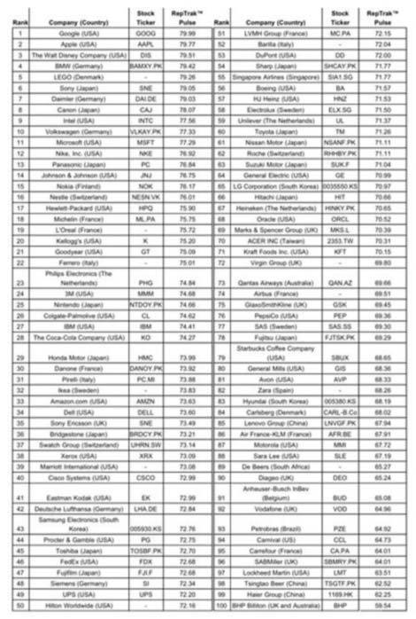 Google được dánh giá là thương hiệu danh giá nhất hành tinh với 79,99 điểm, đứng thứ 2 là Apple  - 79,77 điểm, tiếp theo là Disney - 79,55 điểm; BMW (79,42), LEGO (79,26), Sony (79,05), Germany's Daimler (79,03), Canon (78,07), Intel (77,56) vaf Volkswagen (77,33). Tên tuổi của Microsoft nằm ngoài top 10 thương hiệu danh giá với vị trí thứ 11.