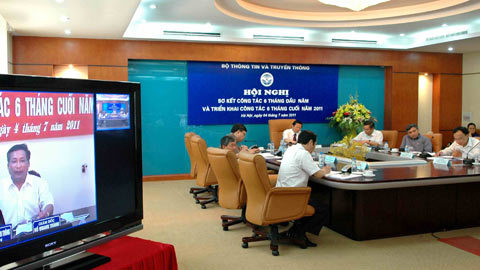 | Lãnh đạo Bộ TT&TT cùng đại diện các Cục, Vụ họp trực tiếp với các Sở TT&TT qua cầu truyền hình trực tuyến sáng 4-7-2011. (Ảnh: Trần Vỹ) |