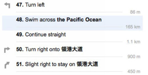 | Đến bước thứ 48, Google Maps khuyên người dùng nên bơi qua Thái Bình Dương với chiều dài khoảng 165 km. |