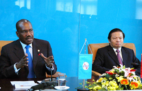 | Tổng Thư ký ITU Hamadoun Touré (bên trái) chia sẻ thông tin tại cuộc gặp các phóng viên Việt Nam dưới sự chủ trì của Bộ trưởng Bộ TT&TT Lê Doãn Hợp (bên phải). Ảnh: ICTnews. |