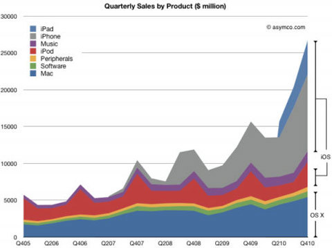 Trong khi các thiết bị cầm tay đang chiếm tới 65% doanh số bán hàng của Apple, thì các thiết bị chạy Mac OS X như Macbook Pro, iMac... lại chỉ nắm giữ 1 tỉ lệ khiêm tốn: 20%.